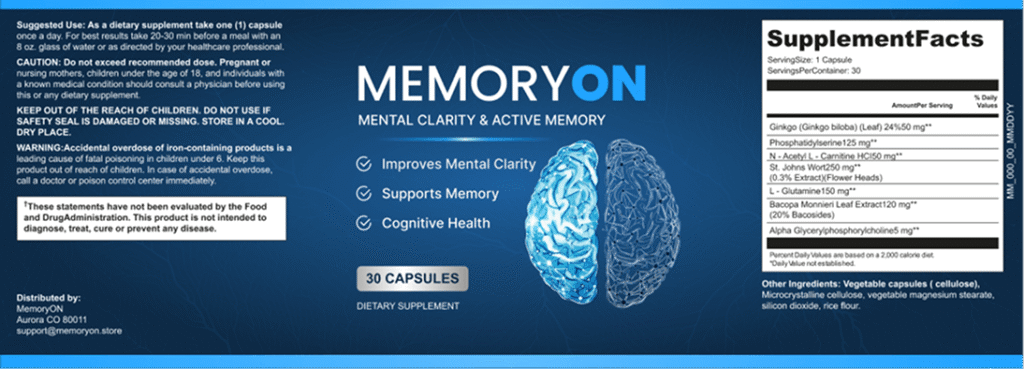 MemoryON is a dietary supplement in capsule form, developed to support mental clarity, memory, and overall cognitive health. Its advanced formula combines carefully selected botanical extracts, amino acids, and brain-supporting nutrients designed to help maintain focus, memory performance, and healthy brain function as part of a daily routine.